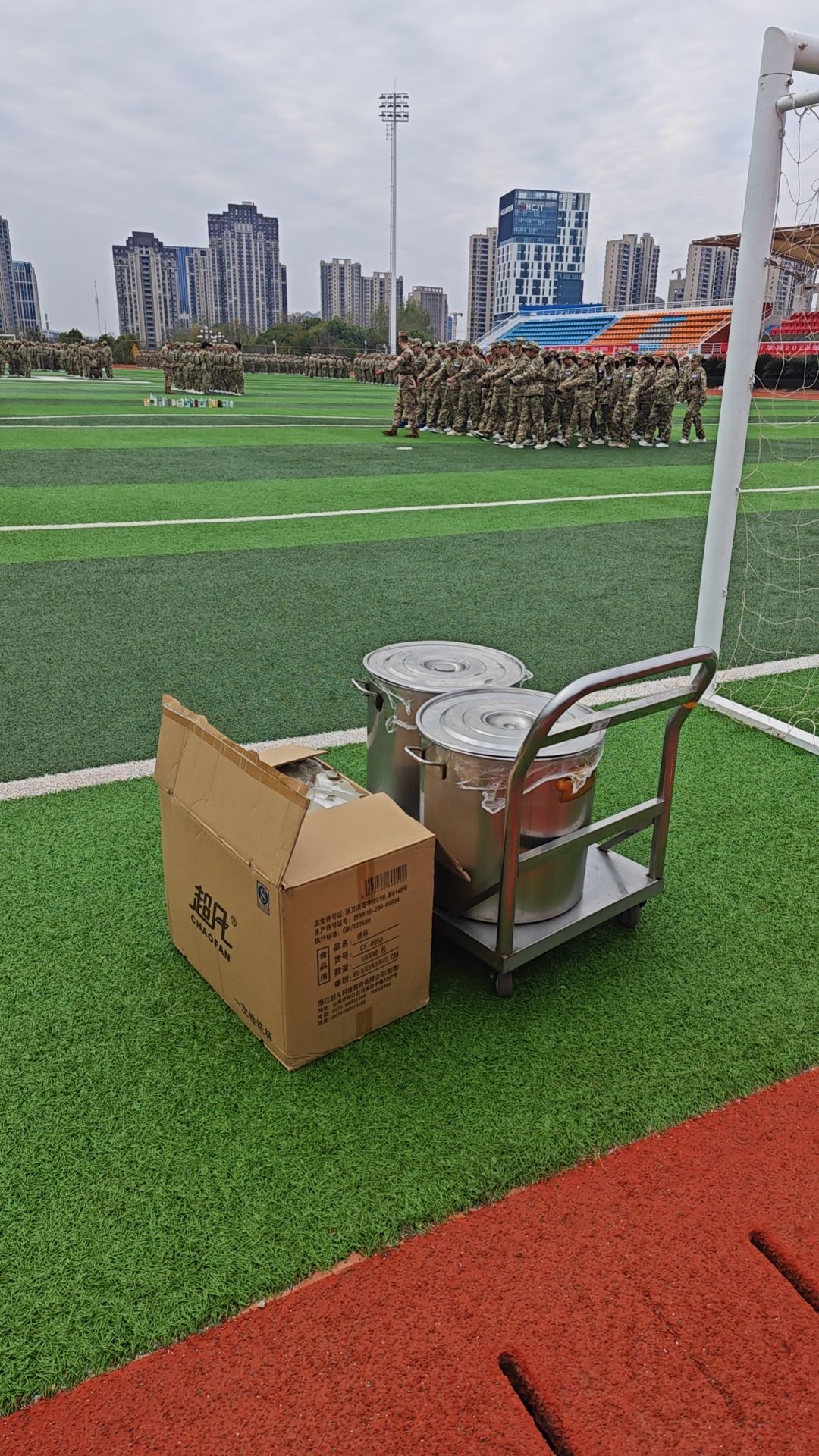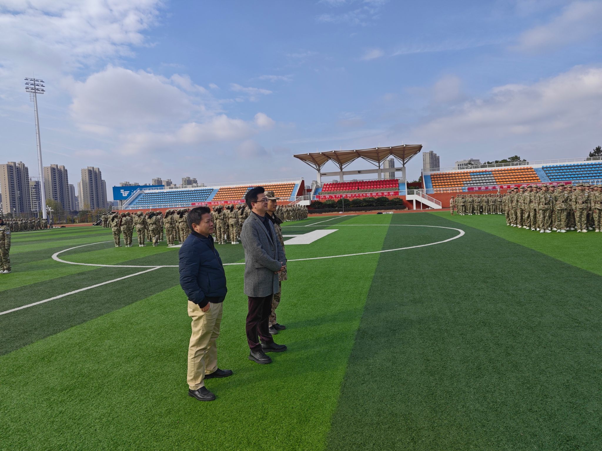 张海涛细致了解军训队列动作以及射击科目训练内容,察看了整体进展以及后勤保障工作情况,问询新生在军训中可能遇到的各类需求。同时强调要科学施训、注重实效,进一步强化新生的国防意识、纪律观念和团队精神,让每一位新生都能在军训中有所得、有所成,有所获。与此同时,学校总务处贴心的送来驱寒姜汤,为在寒冷天气中坚持训练的新生们送去温暖与关怀。