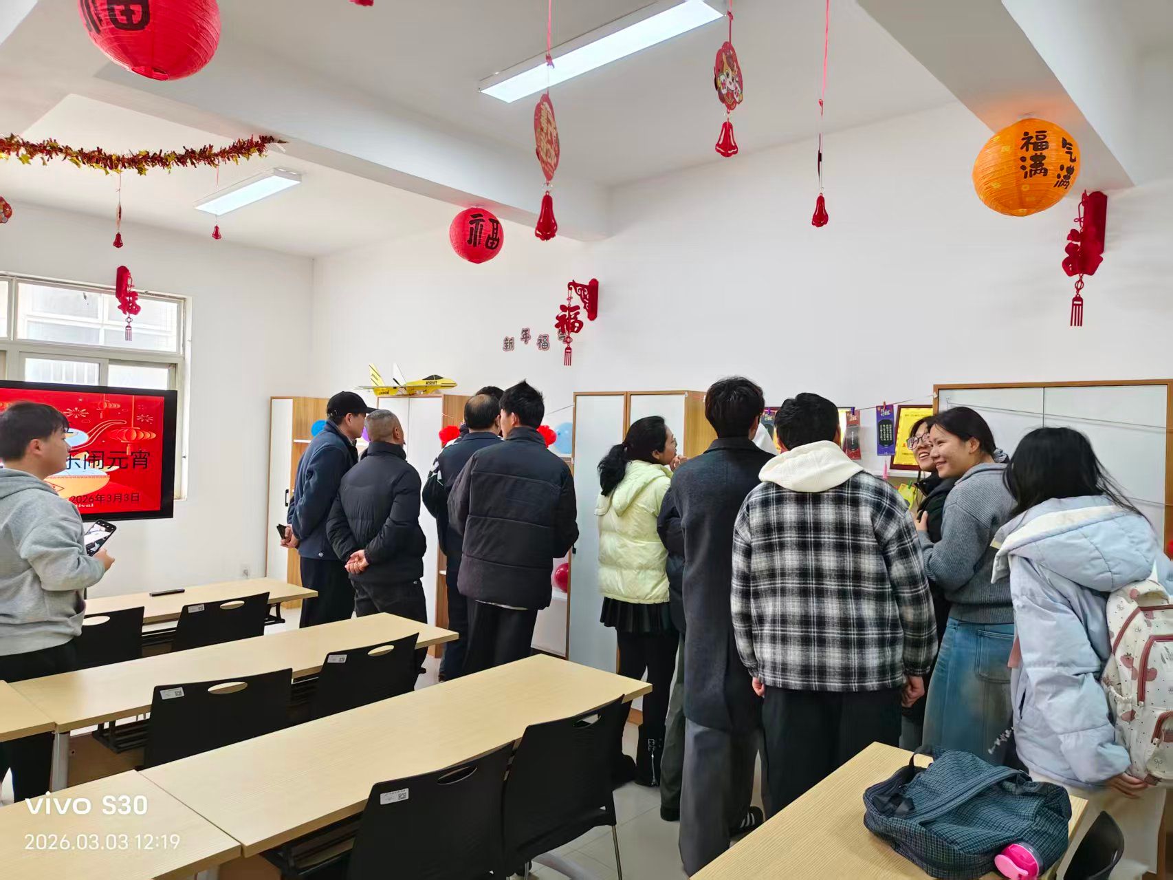 2026年3月3日元宵佳节,飞行技术学院12栋一站式学生社区辅导员工作室热闹非凡,一场“花灯映校园,喜乐闹元宵”活动在此欢乐开展,飞行技术学院党总支书记杨豪,飞行技术学院院长杨大鹏、王武民,飞行技术学院党总支副书记程斌,温韬博士等与学生齐聚猜灯谜。