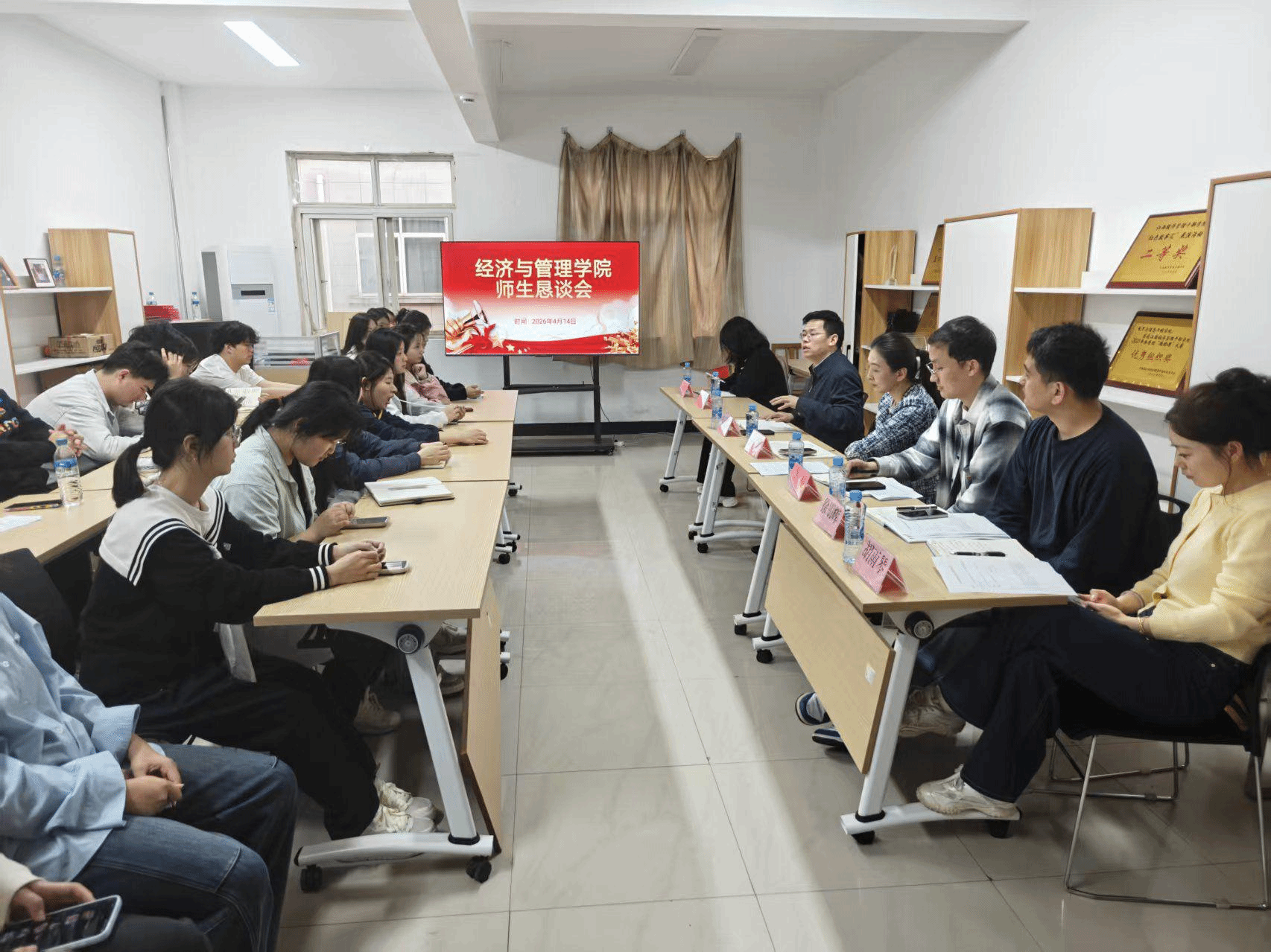为畅通师生沟通渠道,倾听学生诉求、解决实际难题,搭建师生交流平台。4月14日下午,经济与管理学院师生恳谈会在学生一站式社区顺利举办。学院副院长杨道田(主持行政工作)、党总支副书记朱舒然,以及相关负责同志出席会议。2024级、2025级本专科共30名学生代表参会,为学院发展建言献策。